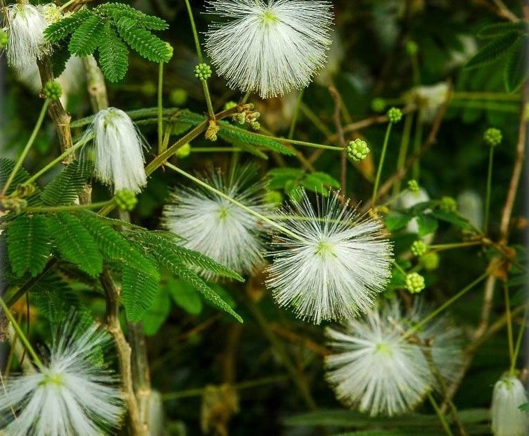heads, with long, feathery stamens resembling pom-poms · Fruit: Linear pods, 5–10 cm long, flat, dehiscent, containing 4–8