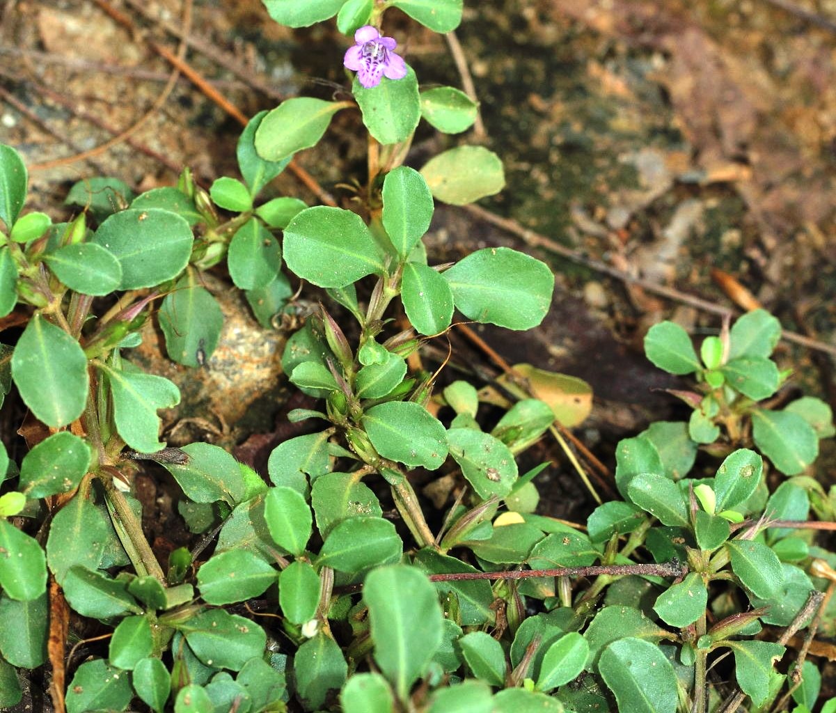 with a sprawling or erect habit. Key features include: · Stem: Quadrangular, hairy, green to reddish, branching at base · Leaves: Opposite, lanceolate to elliptic, 2–6 cm long, 1–2.5 cm