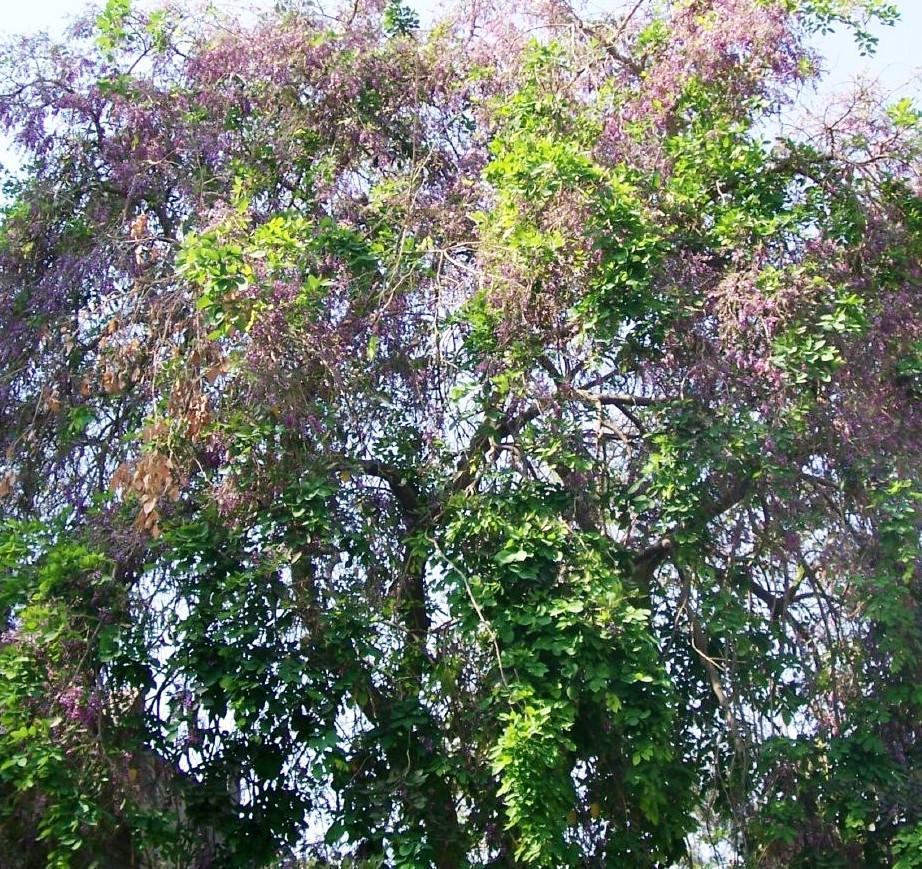 leaflets, each 5–10 cm long, dark green above, paler beneath (Keay, 1989). · Flowers: Purple to violet, pea-like, 1–2 cm long, in dense, pendulous