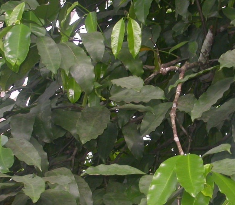 glossy green above, paler beneath, with entire margins. · Flowers: White to yellow, fragrant, 2–3 cm long, in terminal cymes; 5